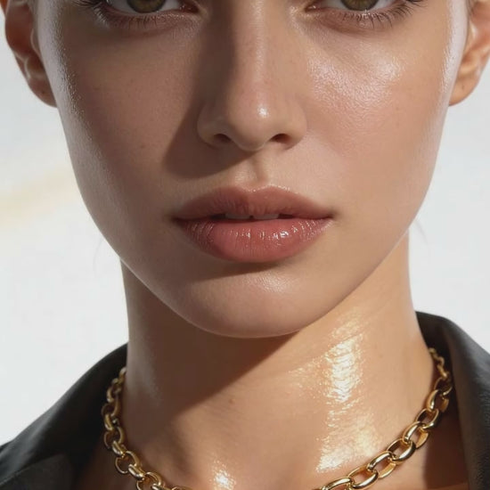 Cadena de diseño moderno con eslabones definidos y cierre tipo carabín como elemento protagonista.